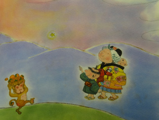 裾模様には、イルカの絵本・ちいさな空の中から「おさびし山の柿ひとつ」をモチーフに「秋のさとやま」を描きました。 |